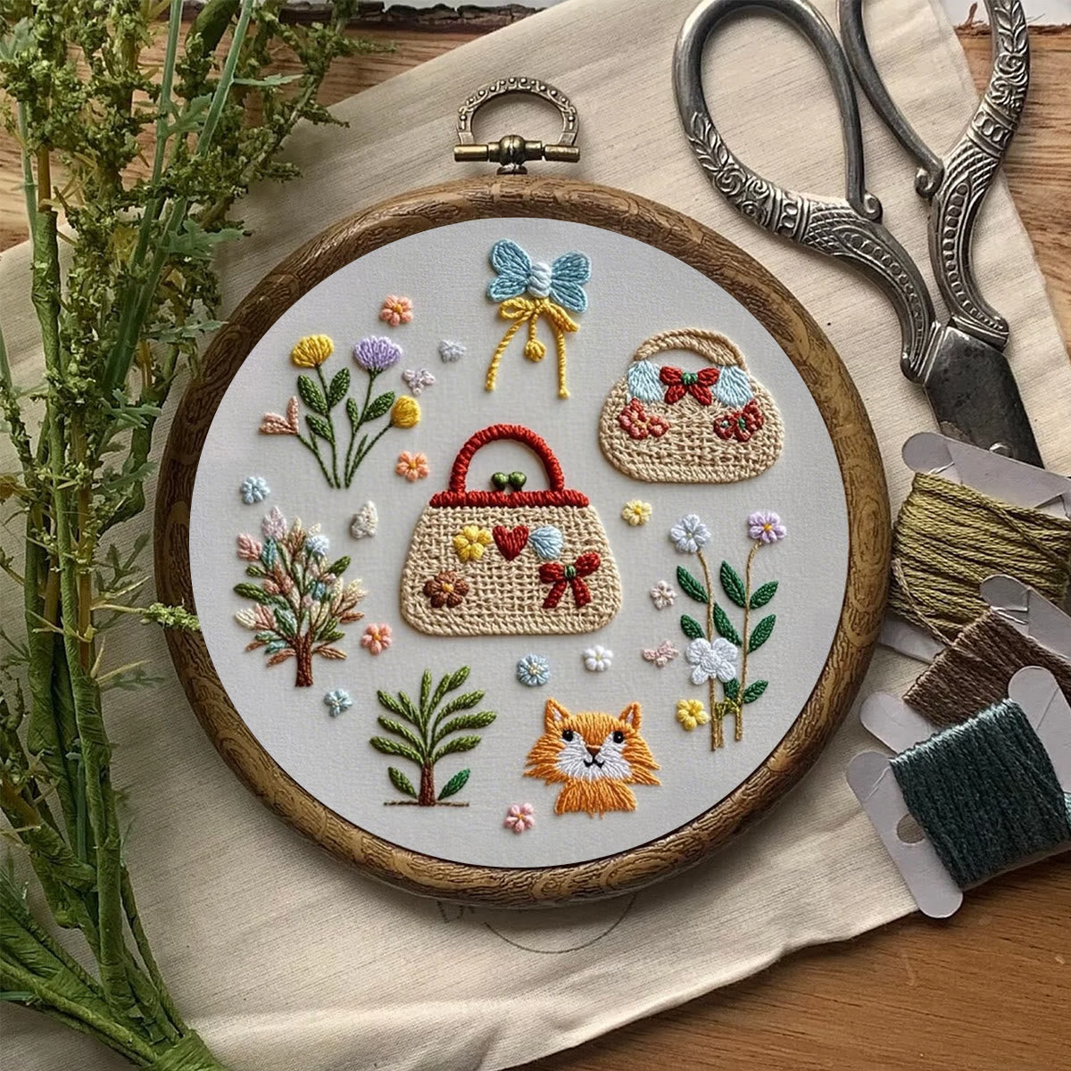Rubbyoo Embroidery Kit- Cozy Pattern with Flowers, bags, cat | Hand Stitch Easy Embroidery Kit for Beginners