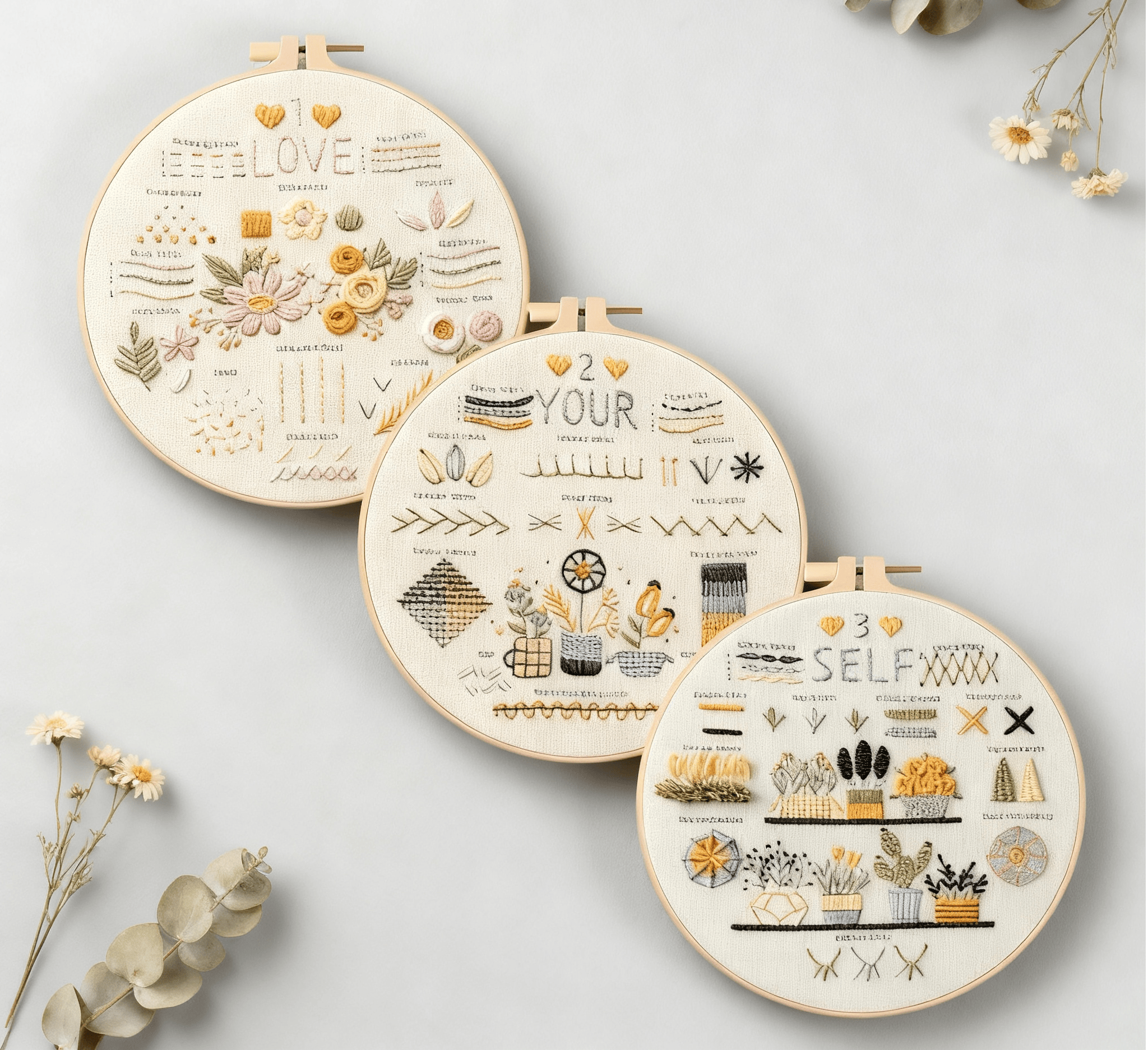 Rubbyoo 3-piece Embroidery Starter Kit - Love Your Self Needlepoint | Floral And Botanical Set | 3 Level Stitch Practice