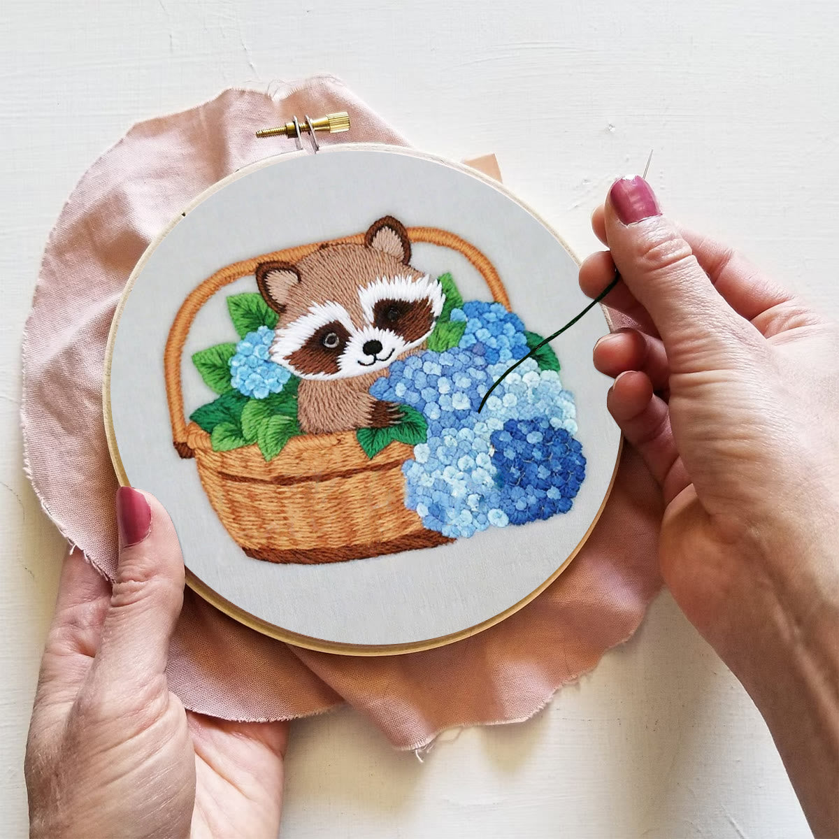 Rubbyoo Embroidery Kit-cute Raccoon In Basket Diy Craft Kits | For Craft Lover
