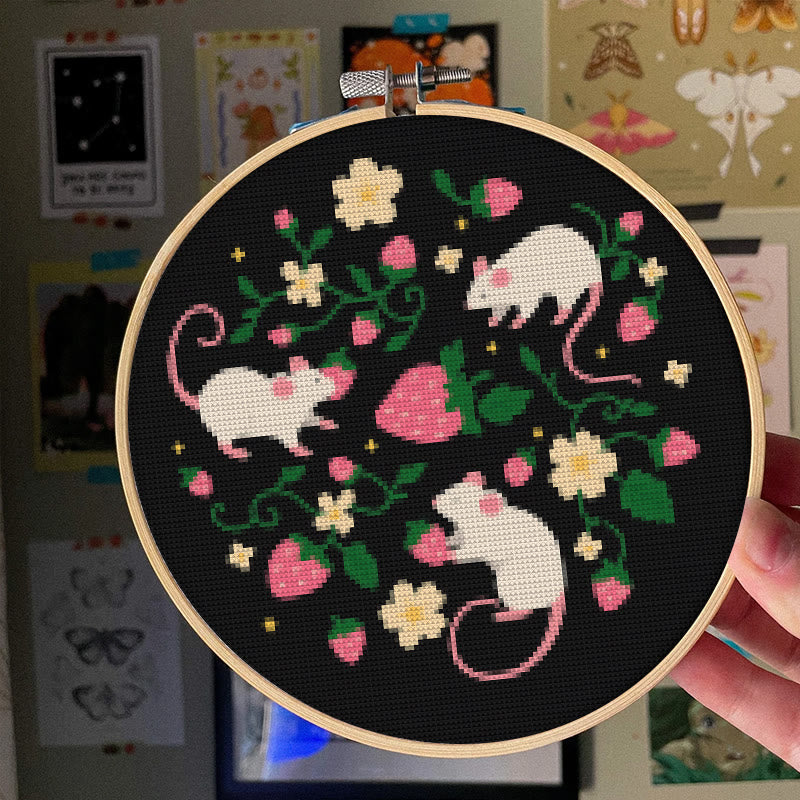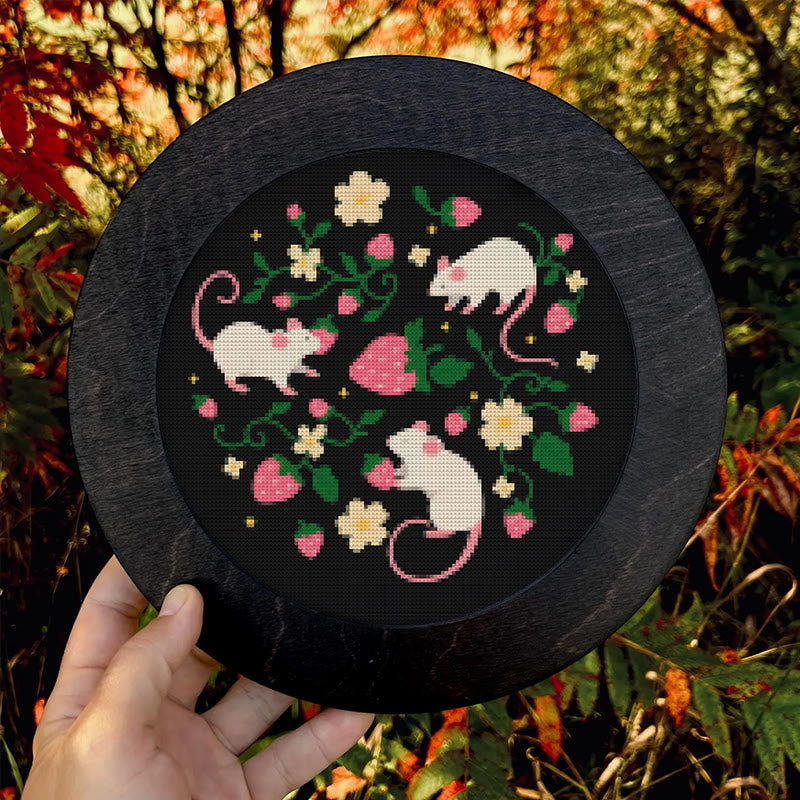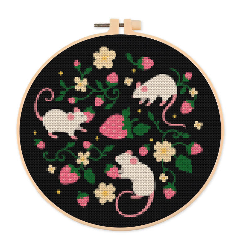 Cross Stitch Kit - Funny Mice With Strawberry | Gift For Rat Lover | Needlepoint Handicraft