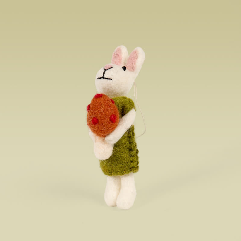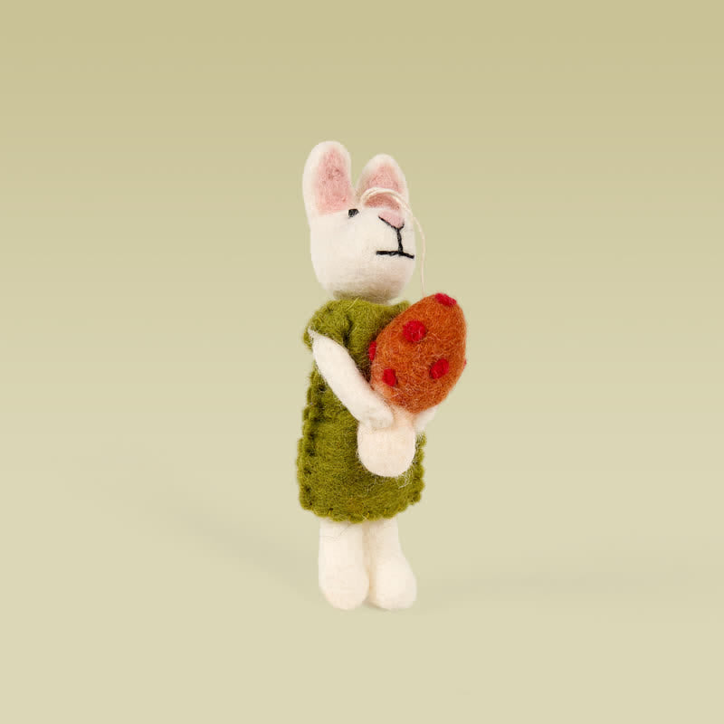 This handmade bunny is dressed in a bright green dress and holds a mushroom. The perfect addition to your holiday decor.