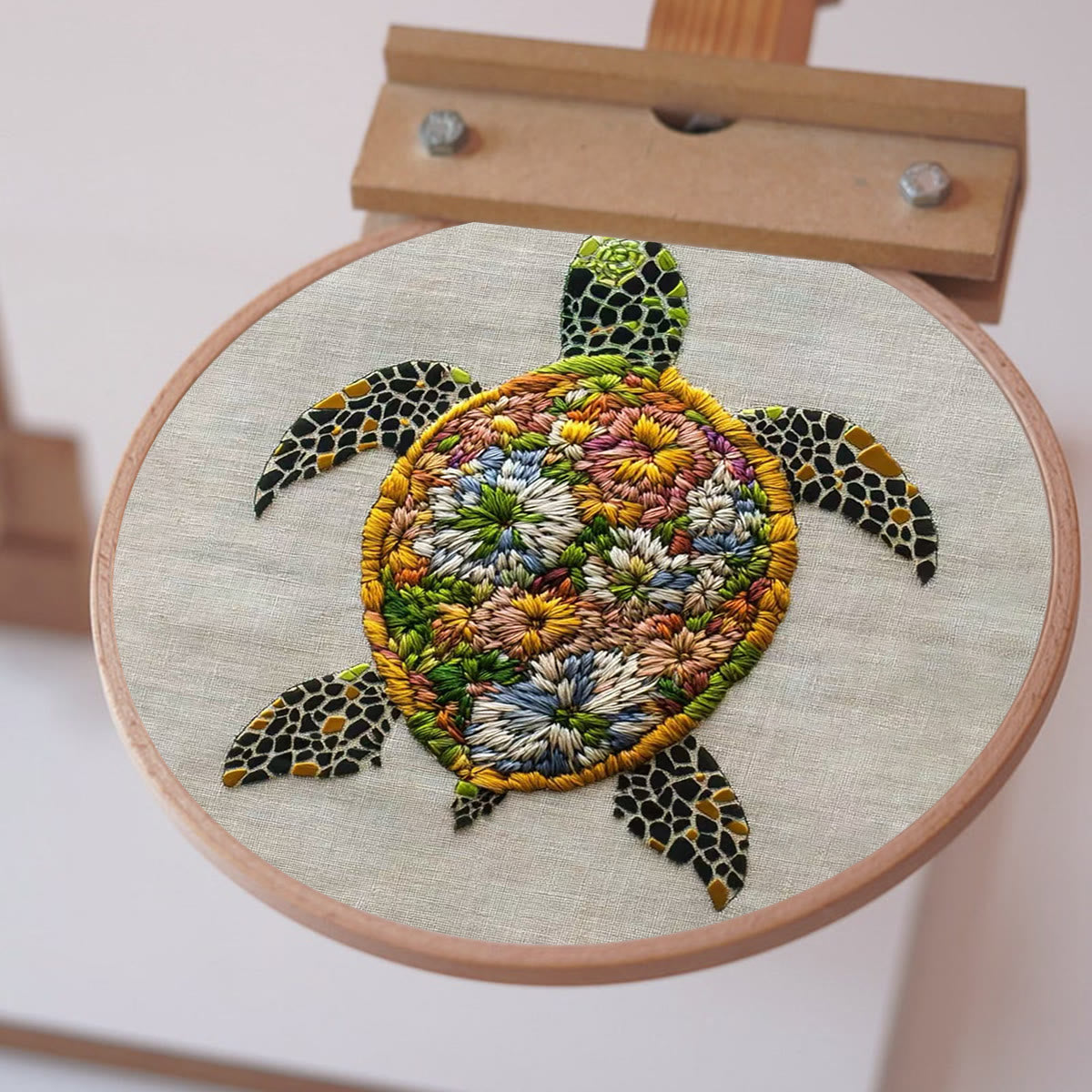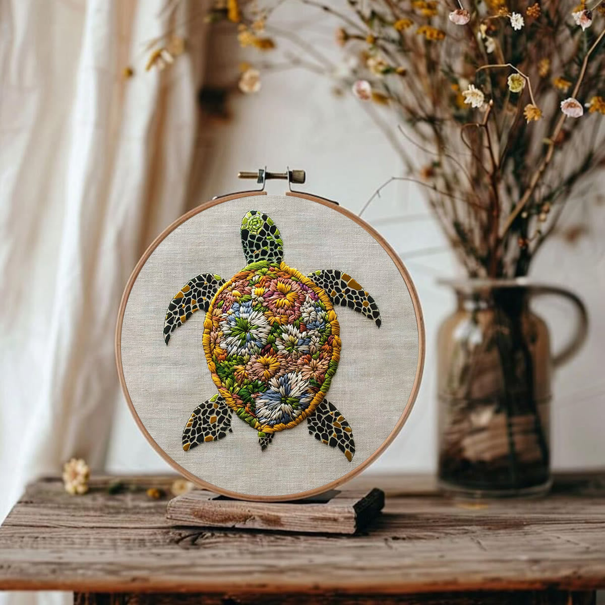 Rubbyoo Embroidery Kit - Flower-Adorned Sea Turtle | Vivid Home Display Piece | Novice-Ready Stitch Project