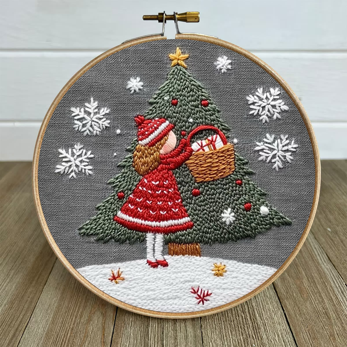 Rubbyoo Embroidery Kit- Girl And Christmas Tree 2 | Holiday Needlework Gift Starter kit
