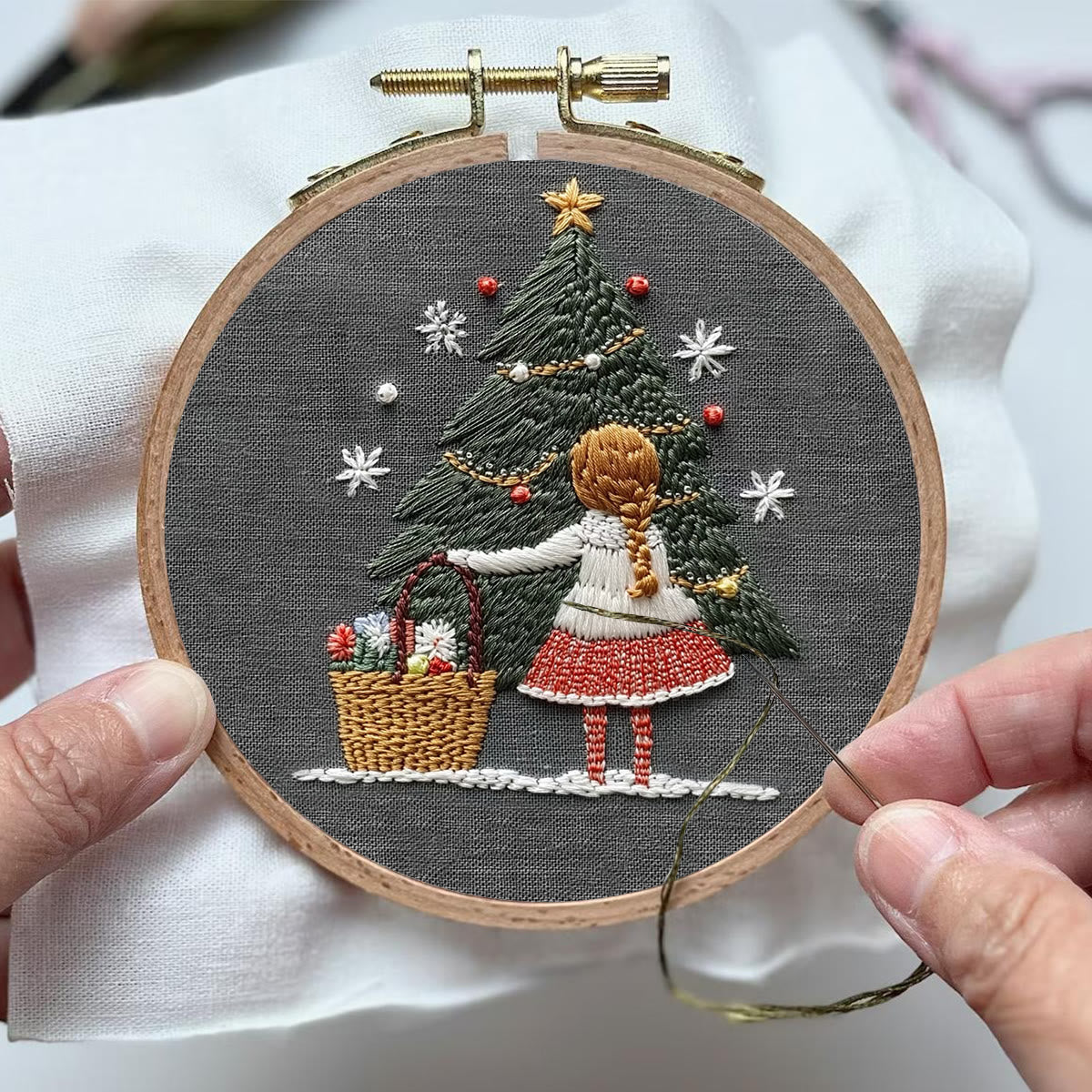 Rubbyoo Embroidery Kit- Girl And Christmas Tree | Holiday Needlework Gift Starter kit