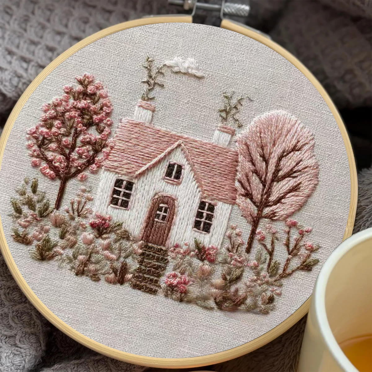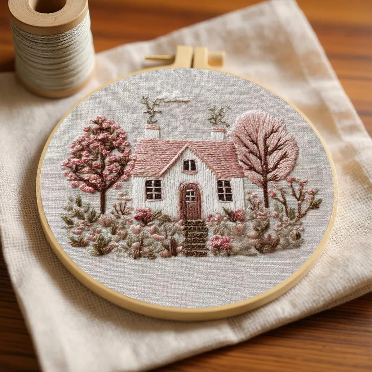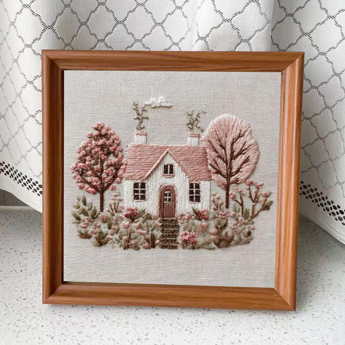 Rubbyoo Embroidery Kit - Pastel Cottage Scene | Cozy Wall Ornament | Newbie-suitable Handmade