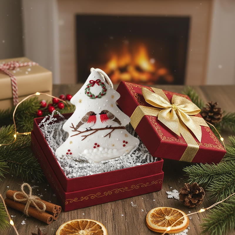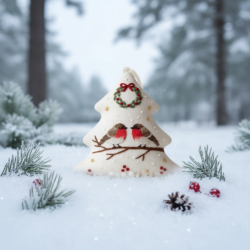Rubbyoo Tree-shaped Embroidery Kit - Robin Perched On Wreath | Handstitched Craft | Festive Home Decor